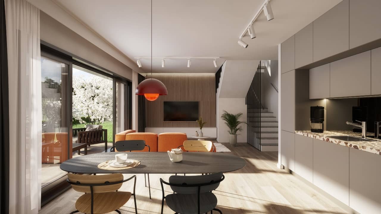 Wnętrze: Salon z otwartą kuchnią i jadalnią.